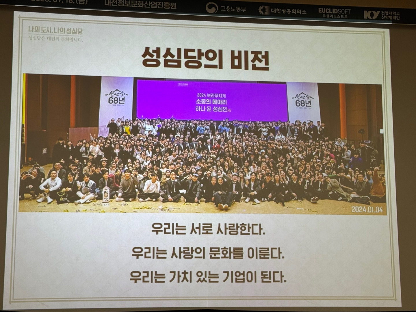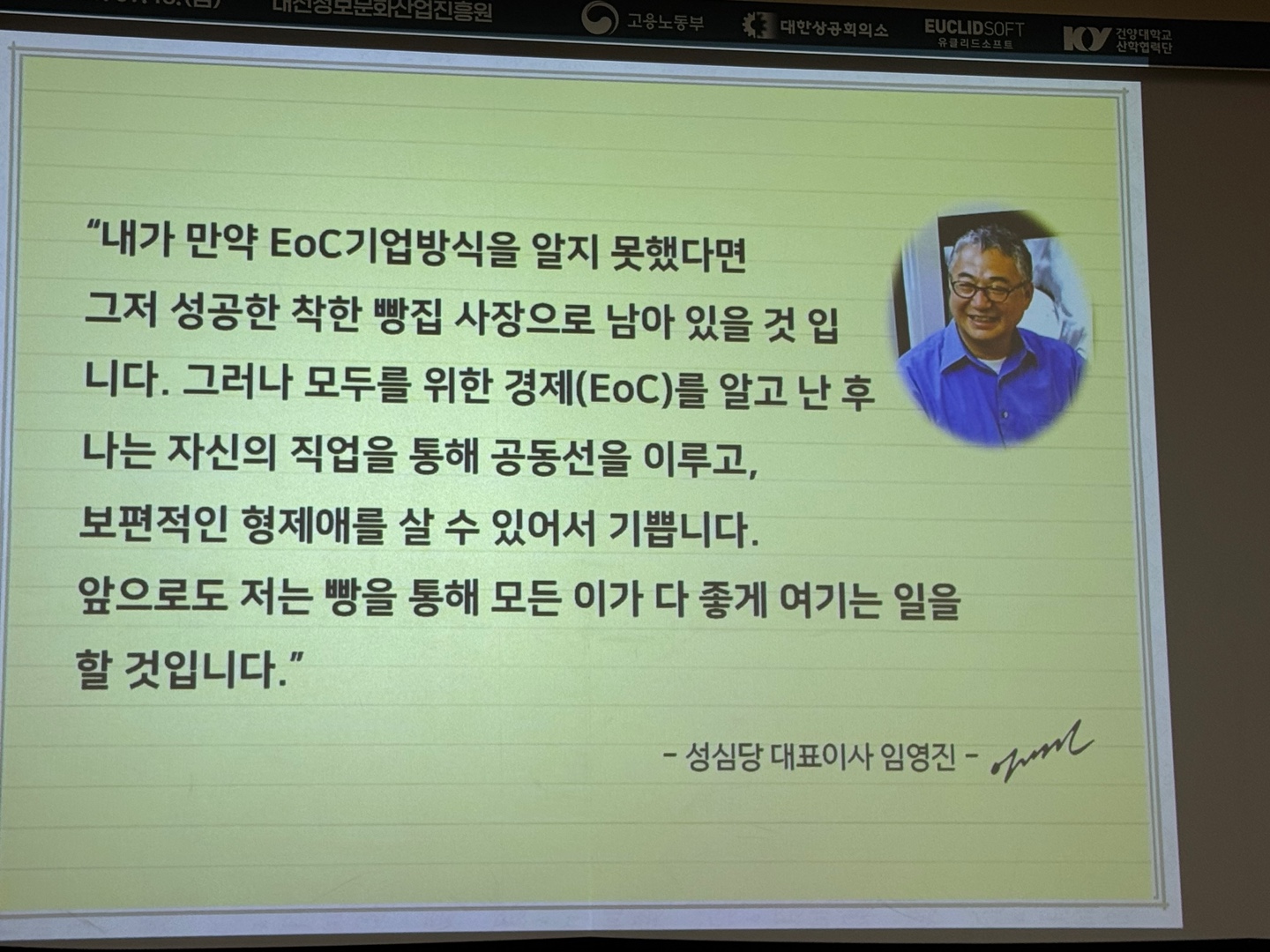 이번 강연을 통해 가장 깊이 와닿았던 점은, 기업이 단순히 이윤을 추구하는 존재가 아니라, 공동체와 함께 숨 쉬고 성장할 수 있는 살아 있는 유기체가 될 수 있다는 사실이었습니다. 성심당은 빵을 파는 곳이지만, 그 이면에는 수십 년간 지켜온 신념과 나눔, 신뢰가 녹아 있었는데요. “당일 생산, 당일 판매”라는 원칙, 화재 후 9일 만에 영업을 재개한 저력, 대전역 입점 거절과 같은 고집스러운 윤리 실천 모두가 성심당만의 철학이자 존엄이었단 것 같습니다.
