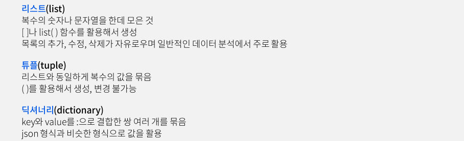 | 구조 | for 변수 in 시퀀스: | while 조건식: |